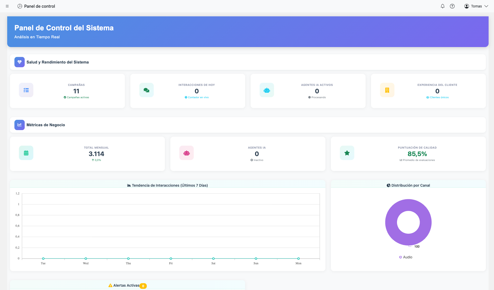 El Dashboard de Auralytik es tu centro de comando para monitorear analiticas de conversaciones en todos los canales. Proporciona una instantanea en tiempo real del rendimiento del sistema, metricas de negocio y salud operacional.