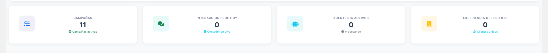 Four KPI cards showing operational status: engagements, interactions, AI agents, and client experience metrics.